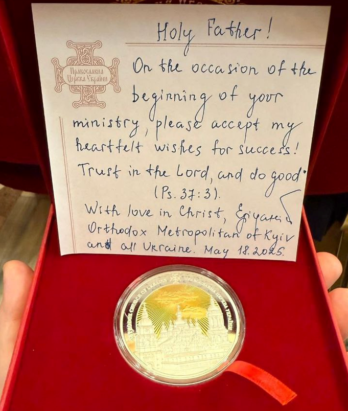 Разом із листом Папі Леву XIV була вручена пам’ятна медаль на честь п’ятої річниці вручення Томосу про автокефалію — символ не лише історичної ваги події, а й підтвердження державної й церковної зрілості Помісної Церкви України.