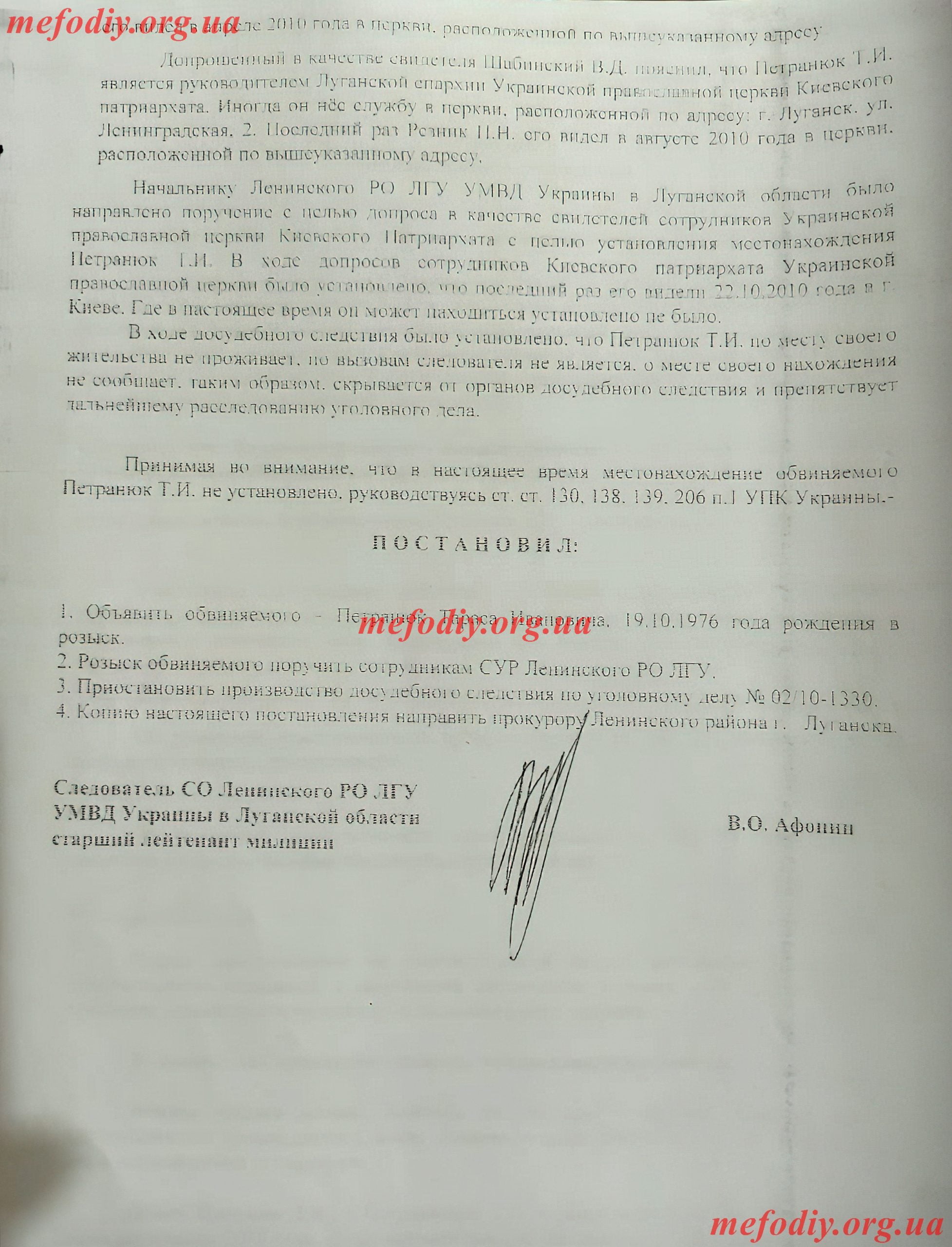15 жовтня 2010 р. надійшла Заява від потерпілого Плугіна Дмитра Володимировича до Управління державної служби боротьби з економічною злочинністю УМВС України в Луганській області,було порушено кримінальну справу №12012030050000359 за ч. 4 ст. 190 КК України (Шахрайство, вчинене в особливо великих розмірах) по відношенню до єпископа УПЦ КП ТИХОНА (ПЕТРАНЮКА ТАРАСА ІВАНОВИЧА 19.10.1976 р. н.), відповідальність за скоєний злочин за законодавством КК України передбачає до 15 років позбавлення волі.
