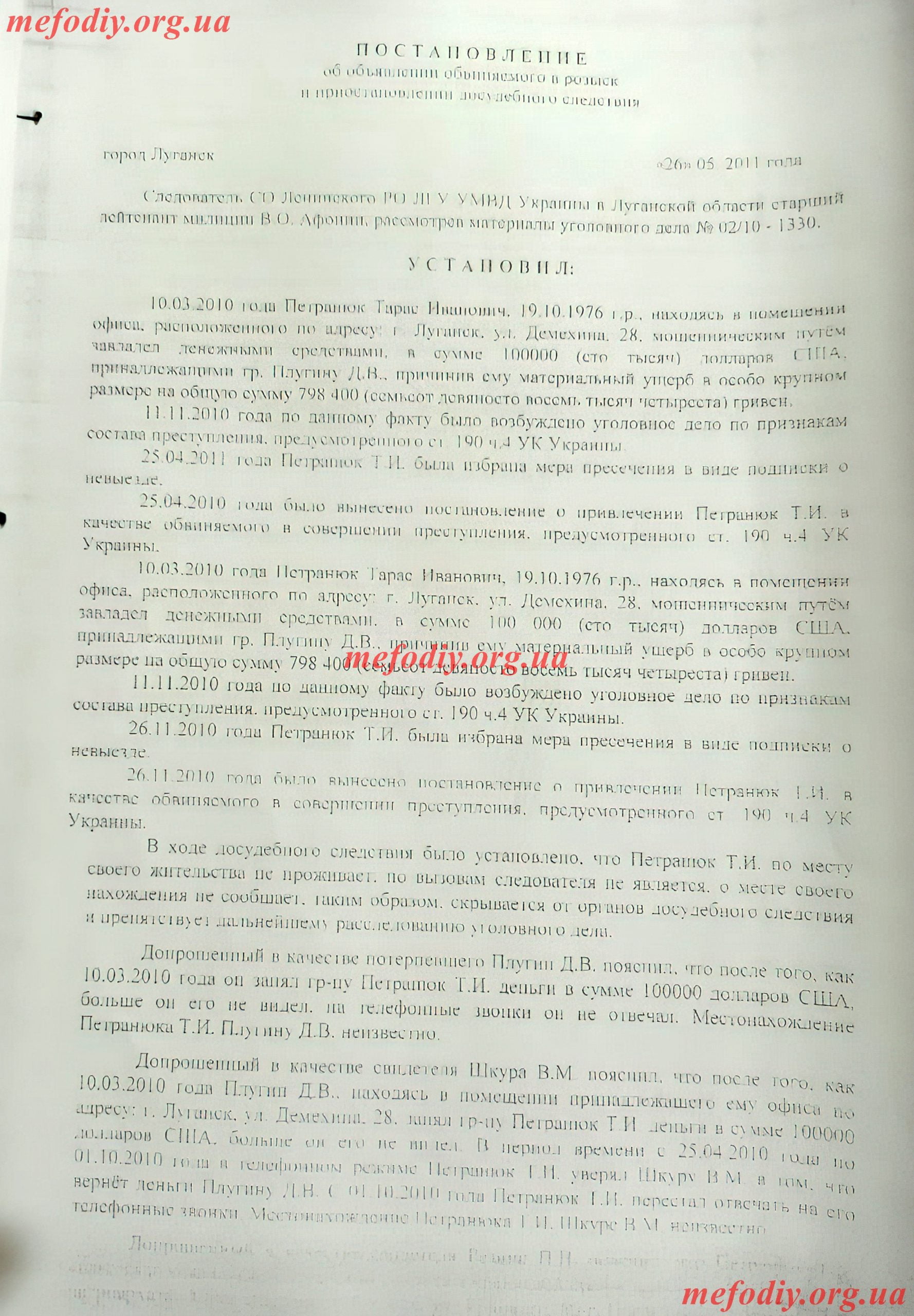 Відомості внесено до ЄРДР 01.12.2012 – фабула – 10.03.2010 року Петранюк Тарас Іванович, 19.10.1976 року народження, знаходячись у приміщенні офісу, розташованого за адресою: м. Луганськ, вул. Демехина, 28, шахрайським шляхом заволодів грошовими коштами у сумі 100 000 (сто тисяч) доларів США, які належать Плугіну Д. В., завдавши йому матеріальну шкоду в особливо великому розмірі на загальну суму 798 400 грн (сімсот дев’яносто вісім тисяч чотириста гривень).