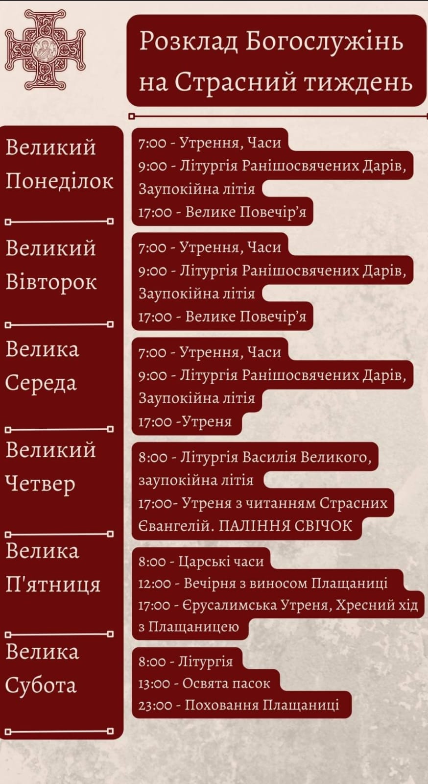 Розклад Богослужінь на Страсний тиждень у Свято-Троїцькому Духовному Центрі на честь князя Данила Галицького (Тернопіль проспект Злуки 28)