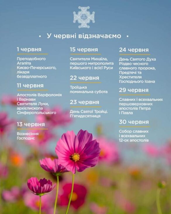 У першому літньому місяці відзначатимемо два з великих дванадцяти свят – Троїцьку поминальну суботу, День Святого Духа та Різдво Іоана Предтечі, а також вшановуватимемо Собор 12-ох апостолів Два великих дванадцять…