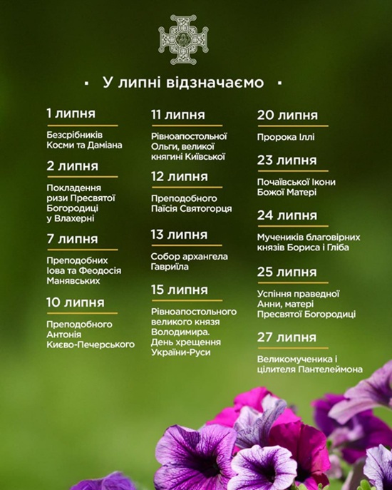 Усі ці дні є нагодою для молитви, єднання вірних, роздумів над сенсом нашої віри і вдячності за духовні дари. Православна Церква України у липні голосно промовляє до нас: будьте святими, як і ваші попередники були святими! Бережіть віру, як найбільший скарб. Моліться за мир і перемогу добра над злом. Слава Богу за все!
