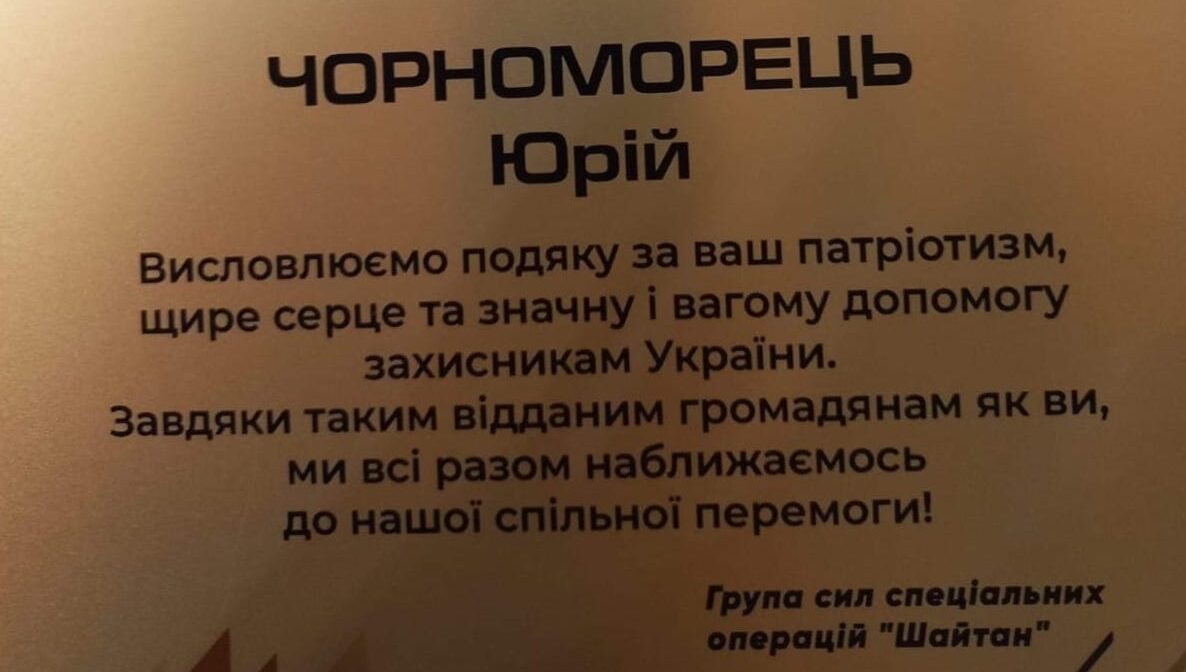 Під час великої та кровопролитної війни, Юрію Павловичу було вручено безліч подяк, відзнак та пам’ятних шифронів; однак він прикріпив лише одну з них на своїй стіні. Ця особлива подяка належить групі людей, яка має велике значення для нього. З метою підтримки лідера та команди цієї групи, Чорноморець готовий зробити все, що в його силах.